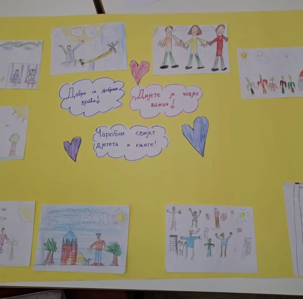 Djeca su učestvovala u kreativnoj radionici ,,Čarobni svijet djeteta i knjige” koju su vodile bibliotekarke Mirjana Žiha, Tina Vukčević i Vjera Popović.