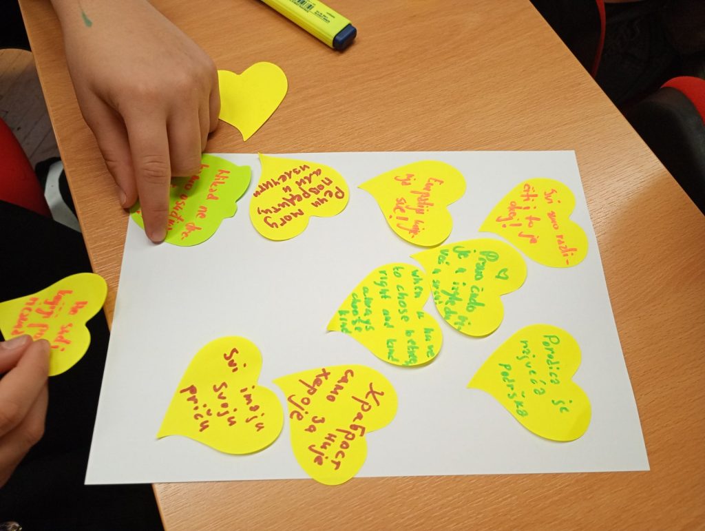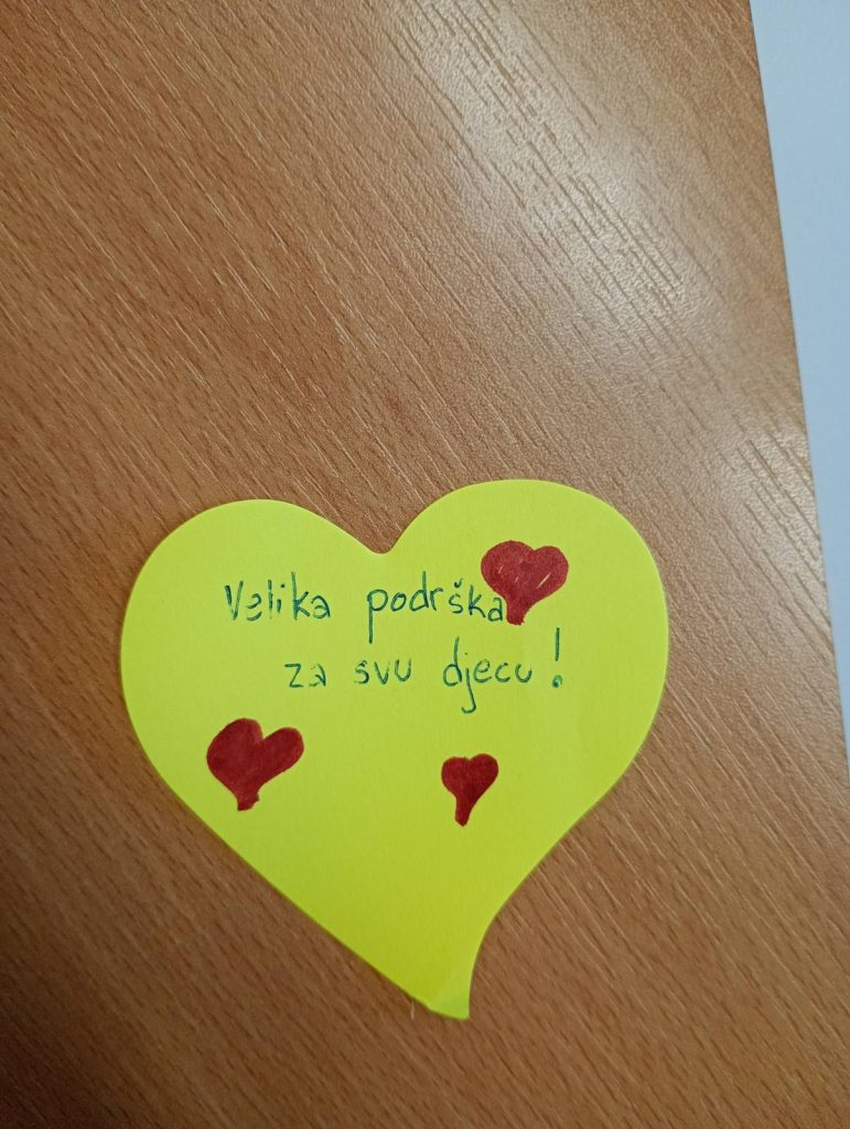 U školskom holu postavljen je interaktivni pano na kojem su učenici imali priliku da ostave poruke o svojim osjećanjima i riječi podrške vršnjacima, čime su simbolično istakli značaj otvorenog razgovora o emocijama.